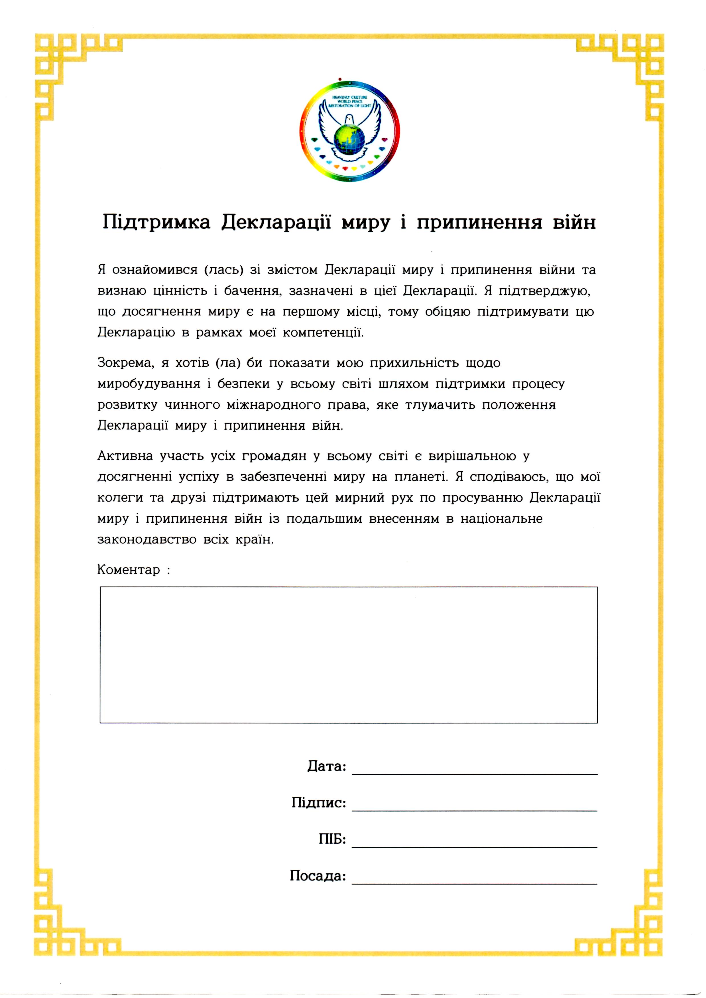 Учасники зустрічі після ознайомлення з основними положеннями Декларації миру і припинення війн підтримали дану Декларацію та від власного імені заповнили відповідну анкету, чим підтвердили підтримку даної Декларації.