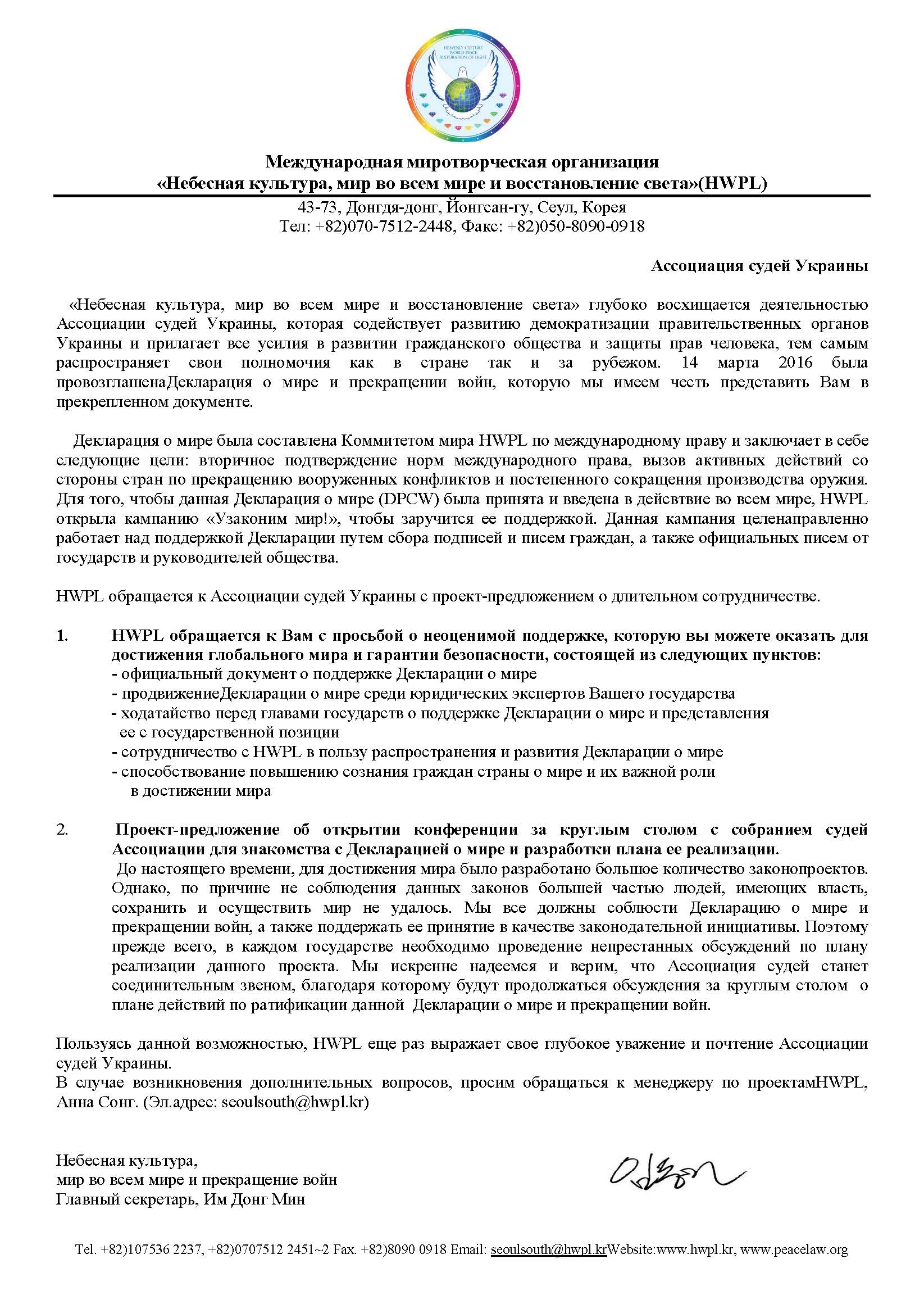 За доручення учасників зустрічі президентом Асоціації суддів України Євтушенко О. І. було передано керівнику HWPL лист про підтримку Декларації миру та припинення війн та згоду на співпрацю ВГО «Асоціація суддів України» та HWPL (Небесна культура, мир в усьому світі і відновлення світла.