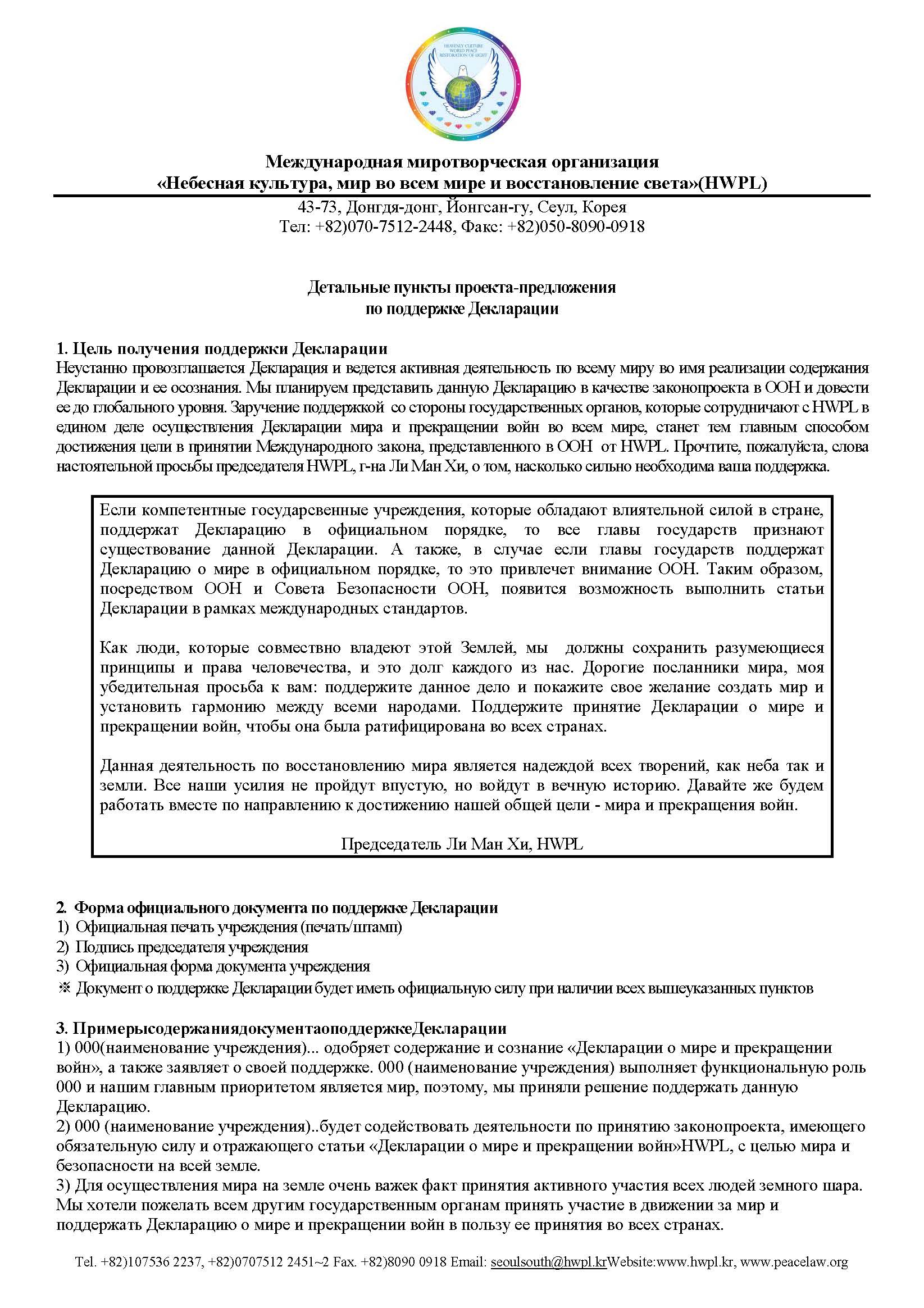 Декларація миру була складена комітетом миру HWPL по міжнародному праву і включає в себе наступні цілі: вторинне підтвердження норм міжнародного права, виклик активних дій зі сторони країн по припиненню військових конфліктів та поступового скорочення виробництва зброї. Для того, щоб дана Декларація про мир (DPCW) була прийнята та введена в дію в усьому світі, HWPL почала компанію «Узаконення миру». Дана компанія цілеспрямовано працює над підтримкою Декларації шляхом збору підписів та листів громадян, а також офіційних листів від керівників держав та громадських діячів.